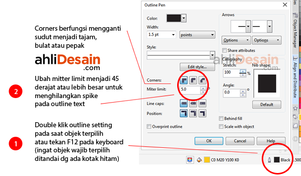 Cara mengubah mitter limit adalah dengan memilih objek / text / shape yang ada outlinenya. Tekan F12 atau double klik pada outline pen. Ubah mitter limit dan atau corners sesuai preferensi yang diinginkan, akhiri dengan klik OK.